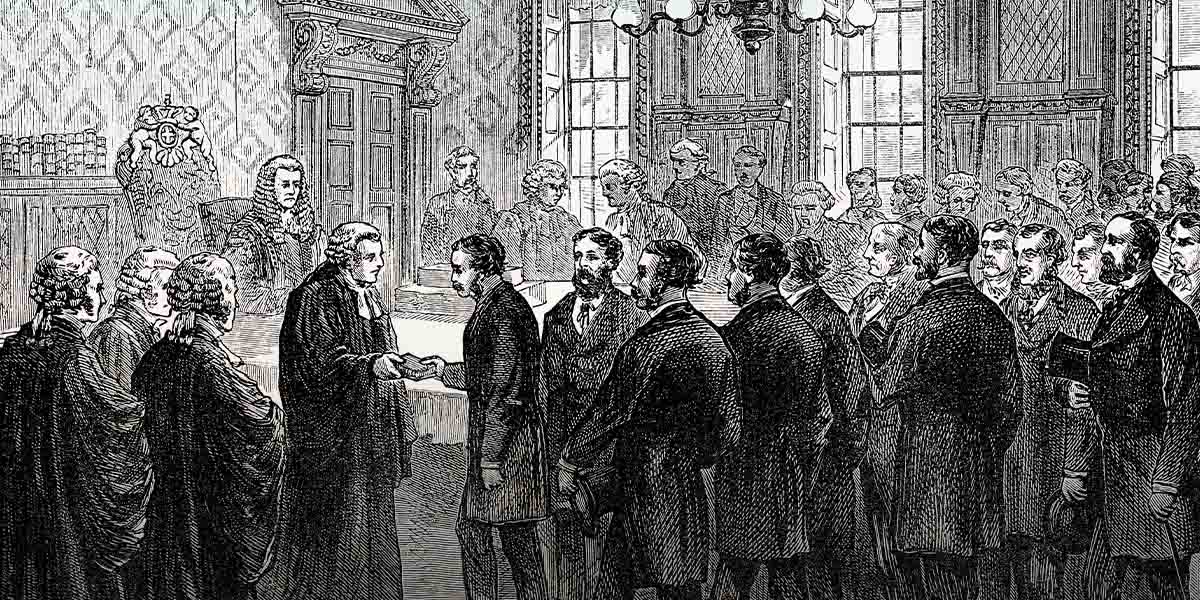 Seated at the head of a large wooden table, the King’s Remembrancer sits with jurors as they prepare to examine the coins brought to the trial that year. Employees from The Royal Mint line up along the left of the hall, ready to distribute the coins that have travelled from Llantrisant. On the right of the hall is a row of chairs for observers, and beyond the large table is a public gallery where people can watch the trial.