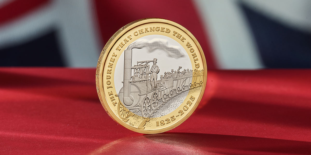 Designed by William Webb, the reverse of the commemorative UK £2 coin struck to celebrate 200 years of the modern railway captures that seminal journey in 1825. The coin also features the edge inscription ‘ACTIVE · LOCOMOTION NO 1’ in tribute to the revolutionary locomotive.
