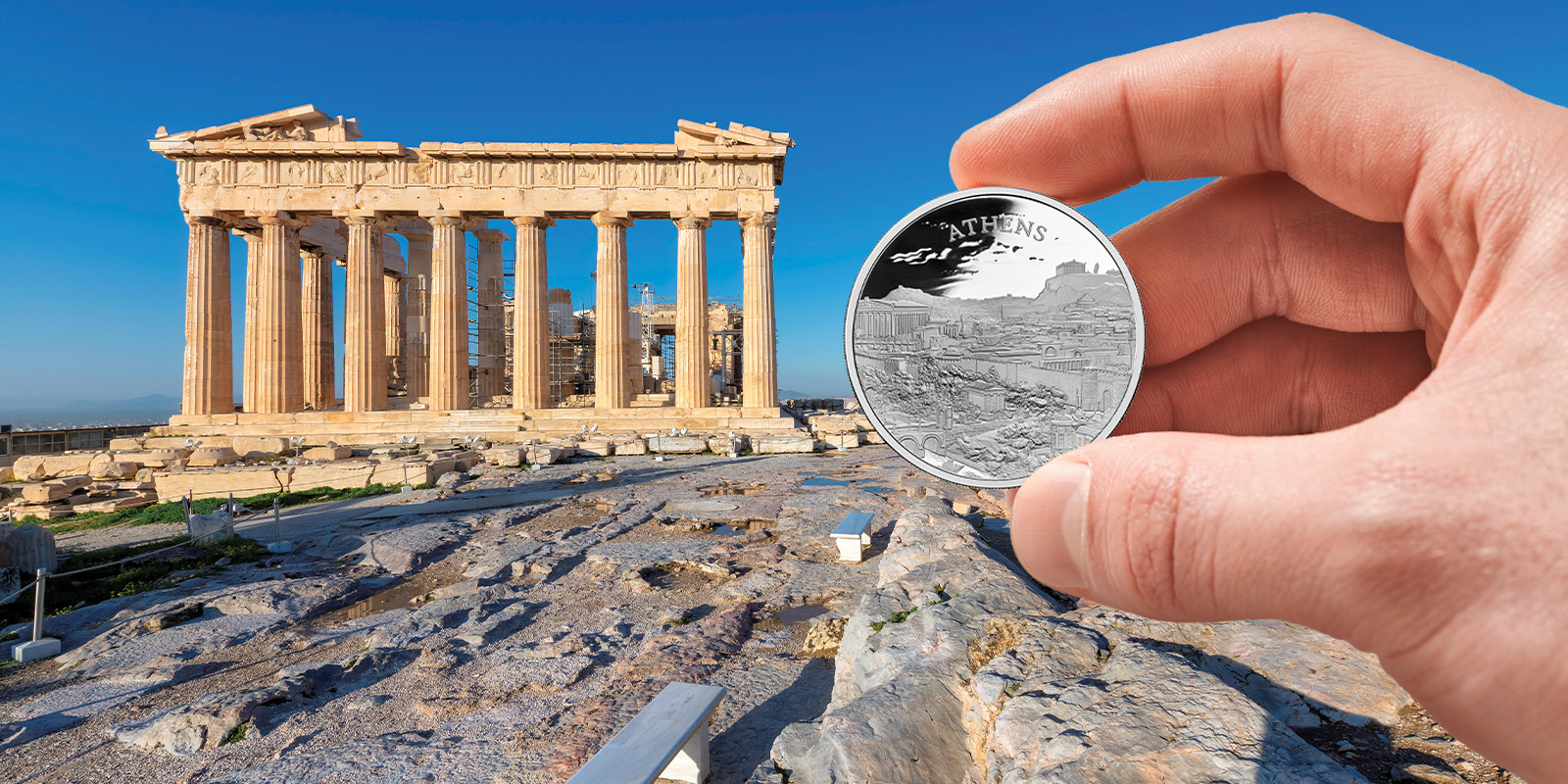 The coin features a panoramic view of Athens, capturing the city’s most iconic landscape. The image is based on historical engravings and illustrations, translating them into a miniature, yet highly detailed, work of art.