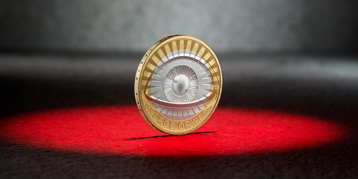 The inscription ‘BIG BROTHER IS WATCHING YOU’, a quote taken from 1984, encircles the lens, whilst another quote from the novel, ‘THERE WAS TRUTH AND THERE WAS UNTRUTH’, serves as the coin’s fitting edge inscription.