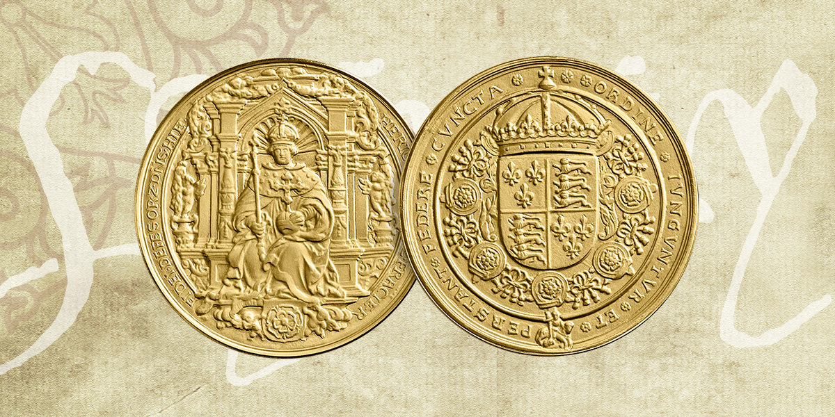 The French bulla, slightly larger than the English, depicts Francis I seated in majesty under a rich cloth of estate, the curtains of which are drawn back by angels. On the obverse of the English bulla, Henry VIII is seated under a grand, Renaissance-style architectural throne, wearing an exaggerated arched crown in response to Francis I’s pretentions to imperial status.