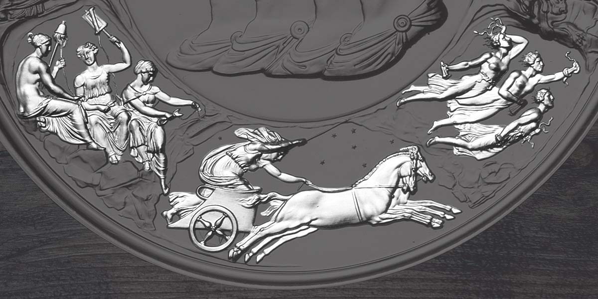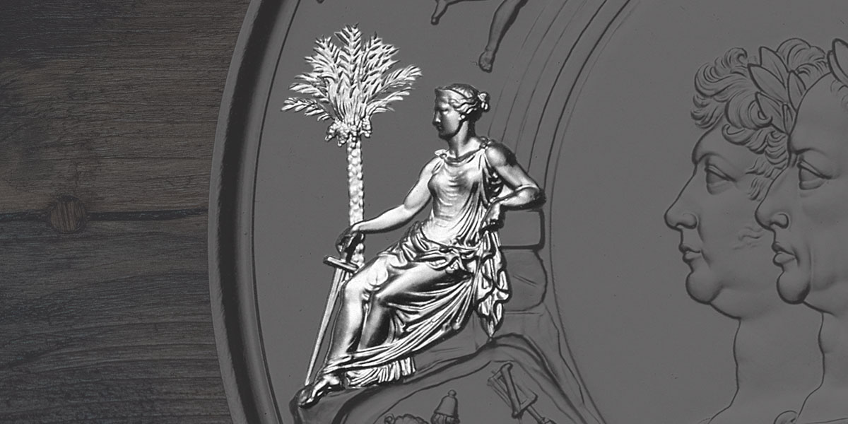 Nevertheless, these electrotypes bore the medal’s design, which is one of inimitable intricacy and consummate detail. Layered with allegorical meaning, the artist has interpreted the Battle of Waterloo through a classical lens, as the design entwines gods and figures from Greek mythology with the events of the battle itself.