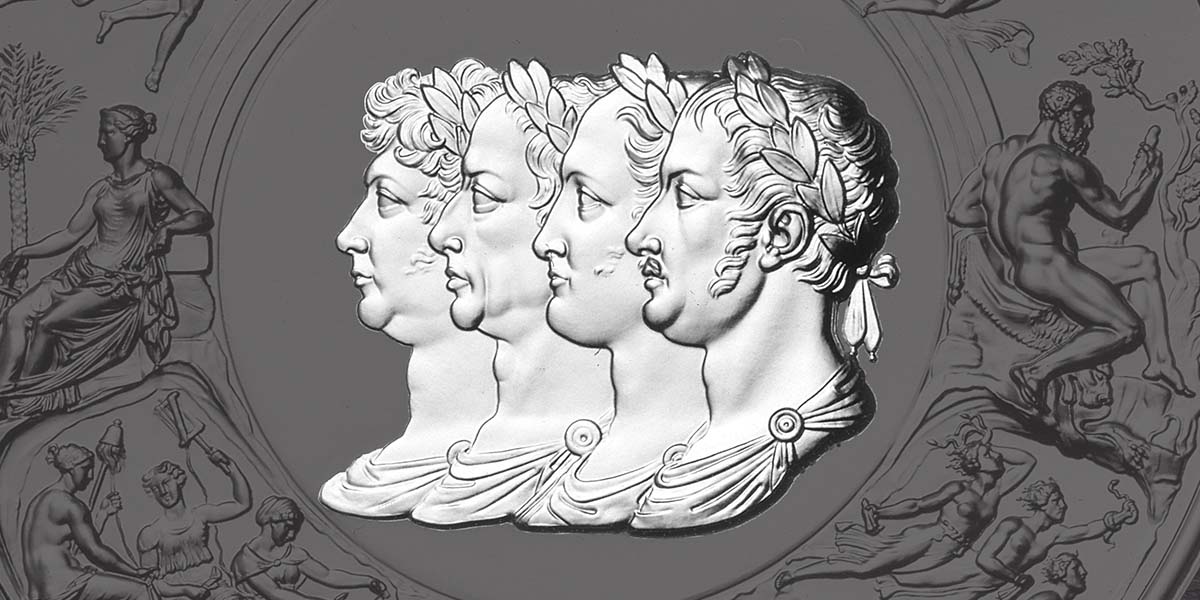 The general design of the medal is treated allegorically, except the central part of the obverse, which represents the busts of the four allied monarchs, seen grouped in profile to the left: George, Prince Regent; Francis II (Emperor of Austria); Alexander I (Emperor of Russia); and Frederick William III (King of Prussia). An array of figures feature in the border framing these portraits, in a thoughtfully constructed tapestry which constitutes an allegorical and mythological allusion to the Treaty of Peace which resulted from the great triumph in the field of battle.