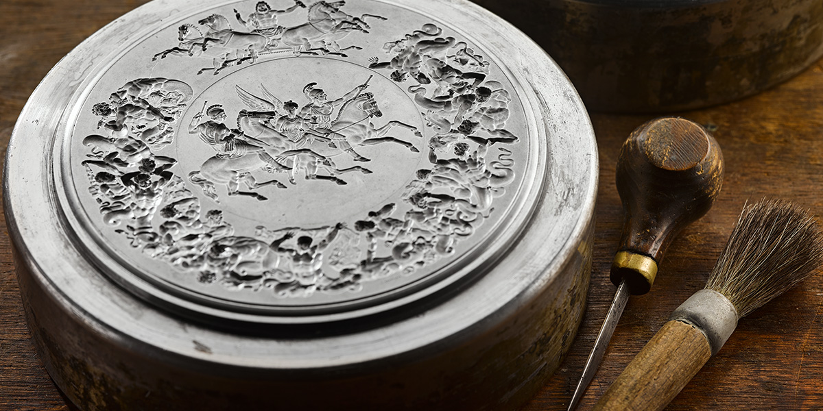 Following a suggestion from his younger brother, the Duke of Wellington, William Wellesley Pole approached Pistrucci to create designs for a medal commemorating the Battle of Waterloo. The work began in 1819 but it wasn’t until 1849 that the dies were delivered to The Royal Mint. They were so large they couldn’t be hardened, so the medal was never physically struck, and the electrotypes were the only fruit of Pistrucci’s 30-year labour.