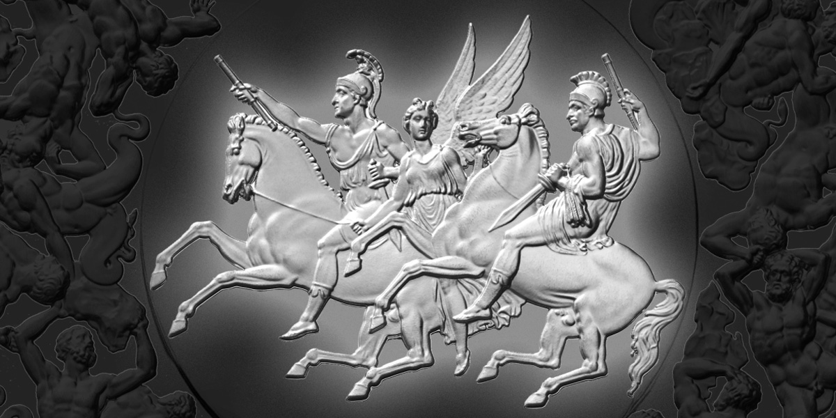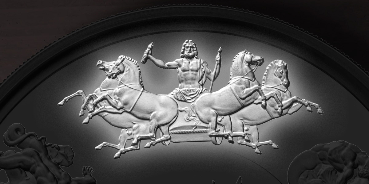 Nevertheless, these electrotypes bore the medal’s design, which is one of inimitable intricacy and consummate detail. Layered with allegorical meaning, the artist has interpreted the Battle of Waterloo through a classical lens, as the design entwines gods and figures from Greek mythology with the events of the battle itself.
