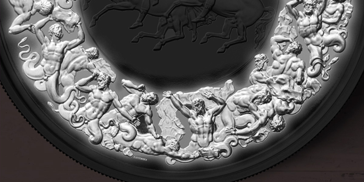 Pistrucci took inspiration from this mythological event to form the border of his reverse design for the Waterloo Medal, in which 19 giants represent the duration of the war. Modern accounts tend to date the beginning of the conflict as 1799 or 1803; however, the 19-year period Pistrucci acknowledges stems from 1796, when Napoleon Bonaparte launched his first campaign in Italy.