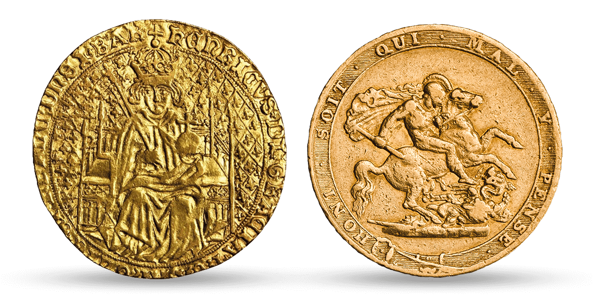 Since it was first introduced to The Sovereign, Pistrucci’s design has undergone a few changes. The 1817 Sovereign featured St George sat astride his horse with a broken spear in hand. The coin also featured a plumed helmet and an old French inscription ‘HONI· SOIT· QUI· MAL· Y· PENSE’, translated as ‘Evil unto him that thinks evil of it’. The plume and inscription were later removed on The Sovereign from 1821, and the date was added below the design. In this remodelled design, the broken spear was also replaced with a sword.