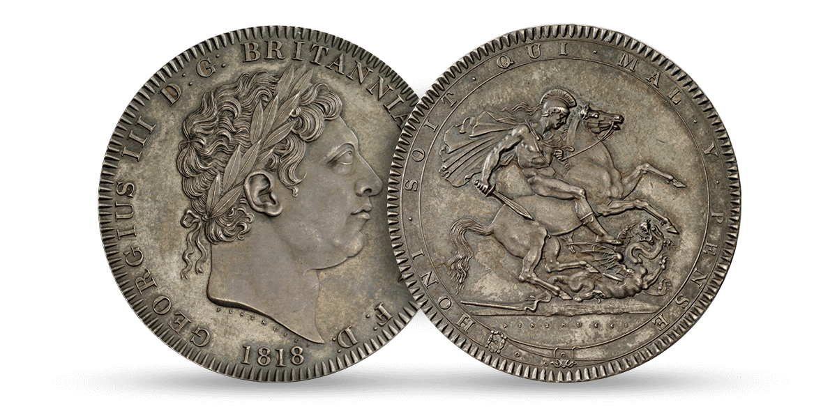 Pistrucci’s beautiful design also featured on the 1818 crown, which Wellesley Pole saw as his crowning glory for the new coinage. These coins received multiple blows on the great Boulton presses with a rate of three coins produced every minute. After these were struck, Pistrucci inspected each coin to ensure they met his high standards. The 1818 crown was described as ‘the handsomest coin in Europe’ by a shrewd contemporary judge, and Wellesley Pole himself described them as ‘unique and inimitable’.
