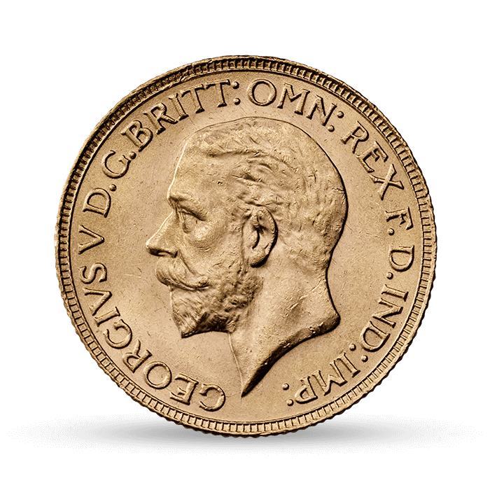 Pistrucci’s St George and the dragon once again features on the reverse of this Sovereign coin, whilst the obverse features a portrait of George V, who faces left, designed by Australian sculptor and medallist Bertram Mackennal. Following his decision to change the name of the Royal House from Saxe-Coburg-Gotha in 1917, due to the anti-German sentiment of the wartime period, George V was the first monarch of the House of Windsor.