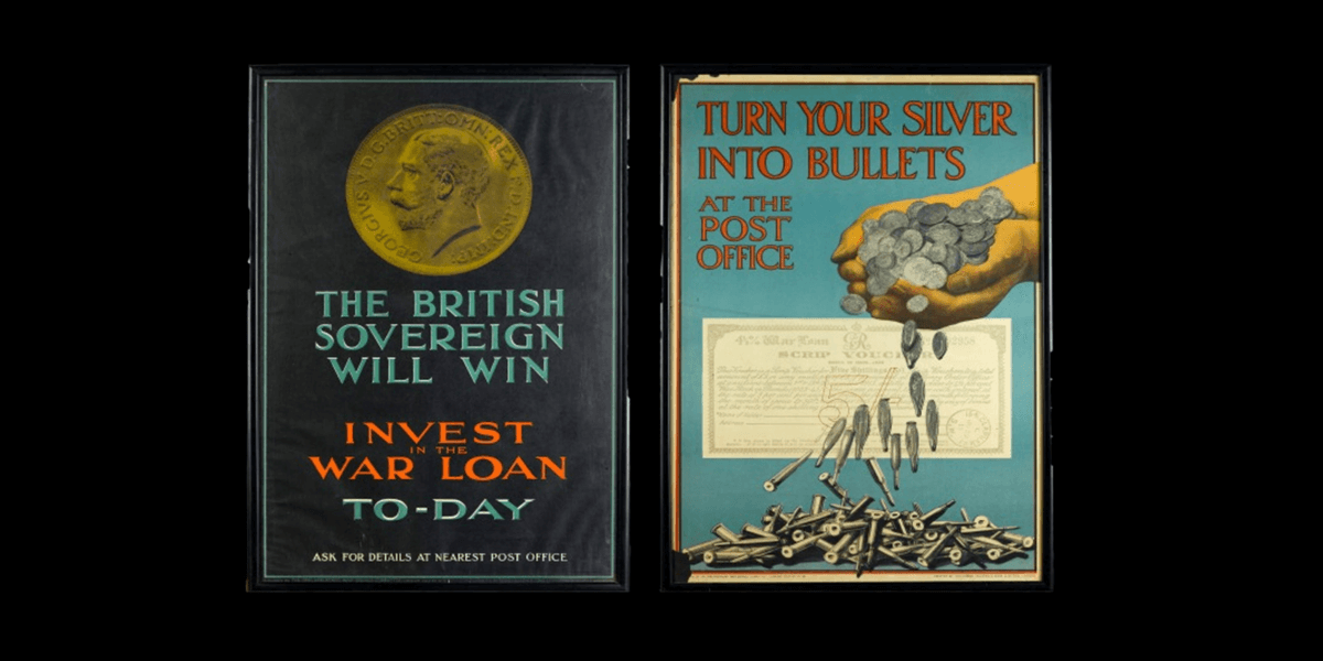 People were encouraged to invest in government loans at the Post Office and colourful posters, such as these two from the Museum collection, were devised to inspire generosity