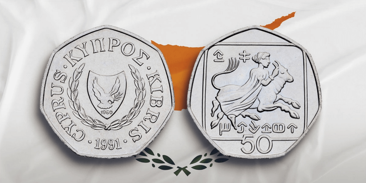In 1983 a currency system of 100 cents to the pound saw the introduction of new coins in aluminium and nickel-brass. For their obverse they retained the emblem of the Republic, but the reverses now show a pied wheatear, a modern vase, an old silver bowl, two goats, a stylised bird, and a cyclamen. A 50 cent coin was added to the coinage in 1985 and, shown here, is the cupro-nickel 50 cent coin of 1991, now seven-sided in shape and showing Europa and the bull.