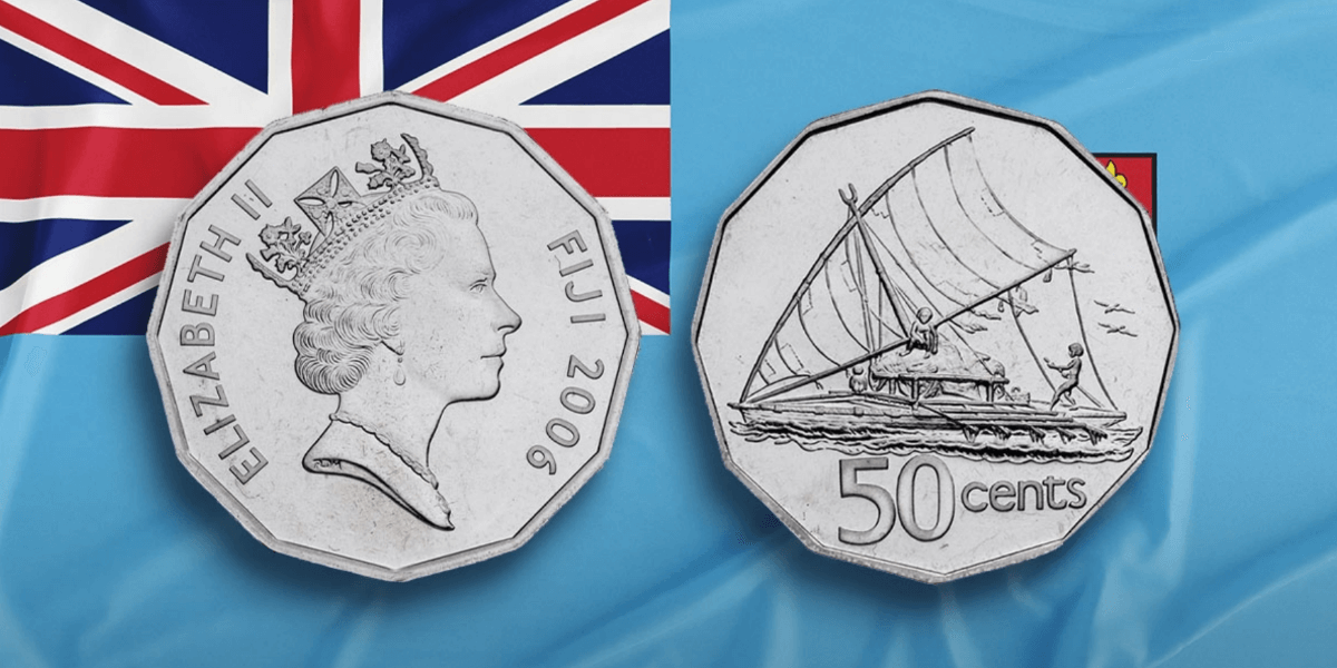Other coins have since been struck for Fiji and shown here is a twelve-sided 50 cent piece of 2006 featuring a small sailing vessel similar to that on the original shilling of 1934.