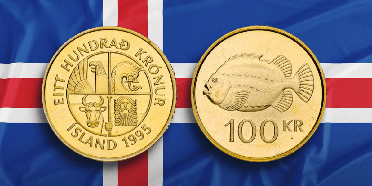 This 100 kronur coin of 1995 features on the obverse the guardian spirits – a bull, a bird, a dragon and a giant – that protect the island, with a north Atlantic lumpfish on the reverse.