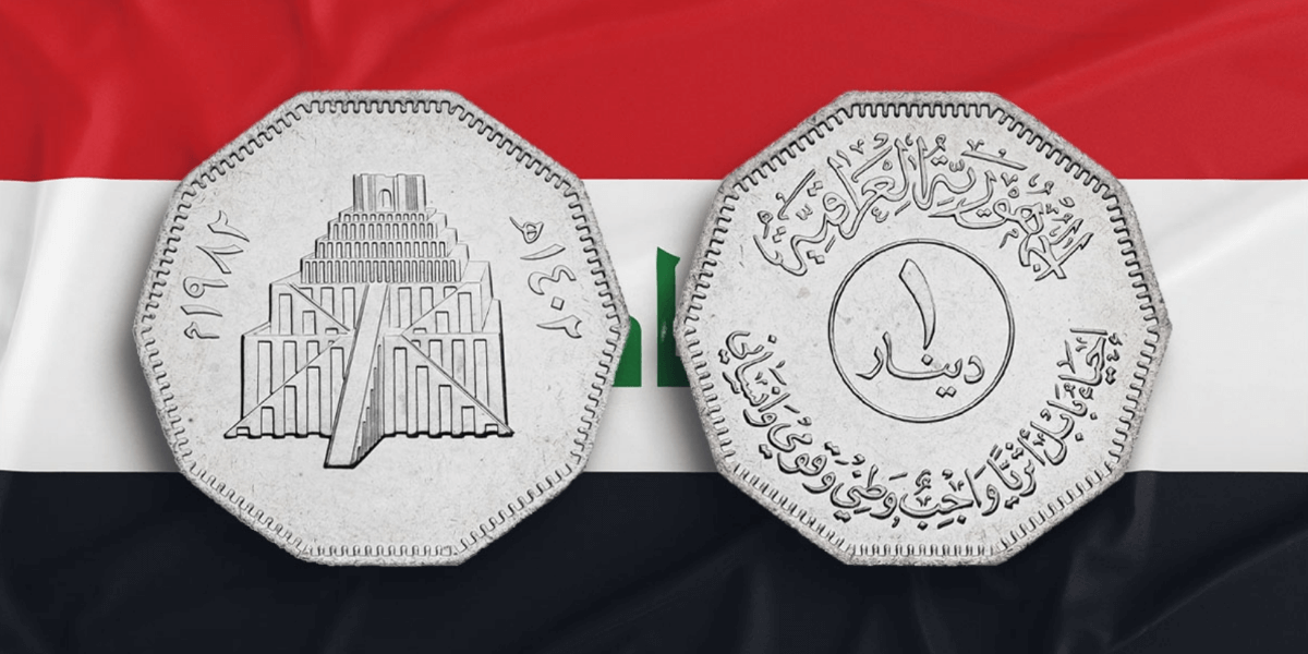 The 1 dinar of 1982, shown here, features the Tower of Babylon.