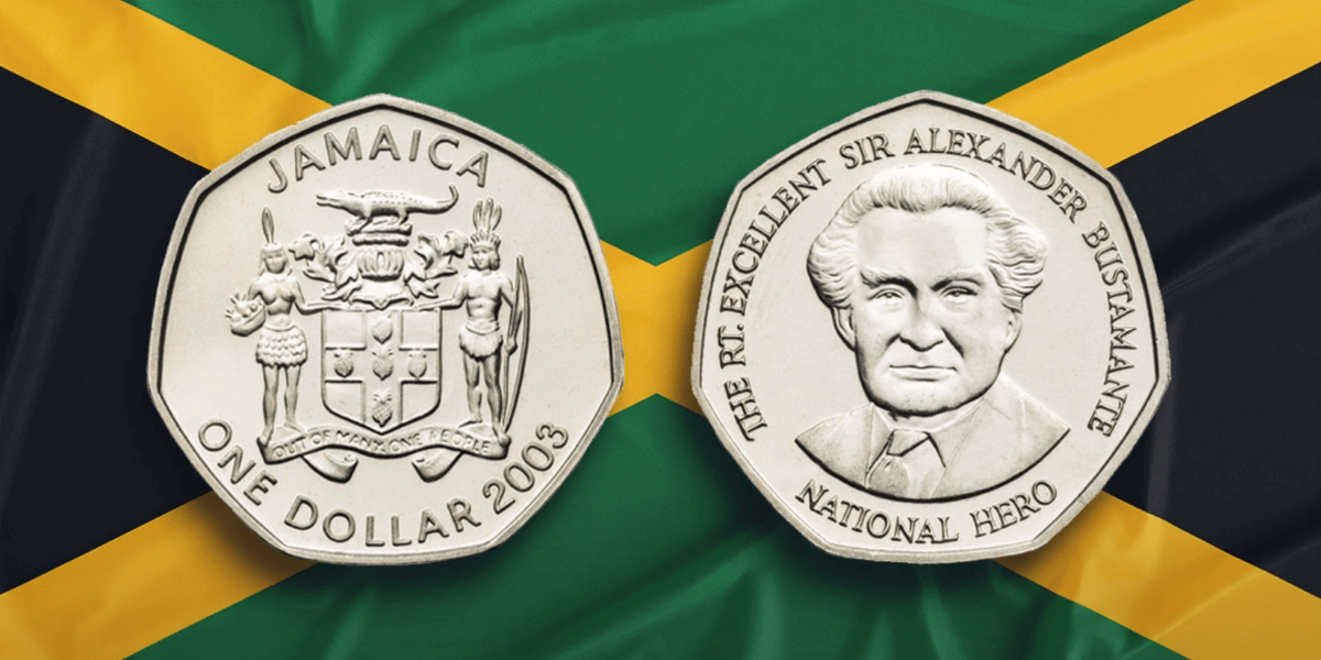 Shown here is a one dollar coin of 2014, which combines the usual Coat of Arms with a portrait of Sir Alexander Bustamante, the first Prime Minister of Jamaica and a national hero.