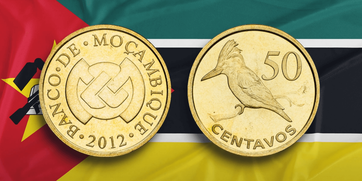In 1998 The Mint struck a coin of 5000 meticais, which combines the arms of the republic with electric pylons. More recently coins have been struck for a new system in which the revalued metical consists of 100 centavos. Shown here is a 50 centavos of 2012, which combines the kingfisher with the emblem of the Bank of Mozambique.