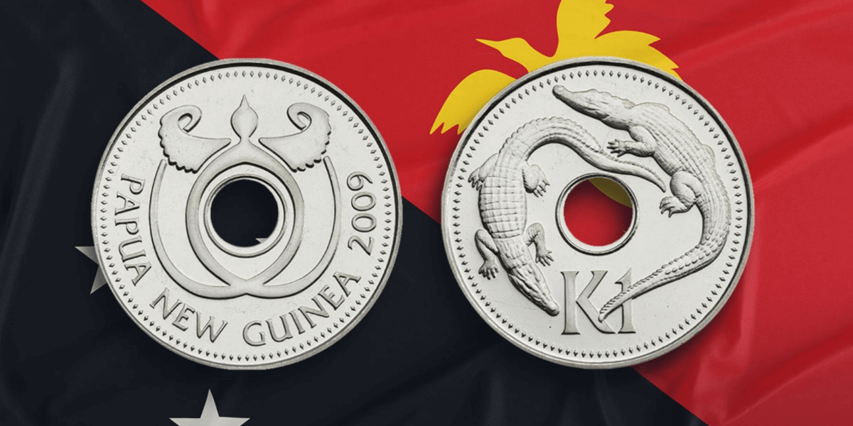 The 1 kina coin deliberately recalls the earlier coins of British New Guinea in having a central hole. Its obverse shows a stylised bird and the reverse two alligators, as seen here on a recent 1 kina of 2009.