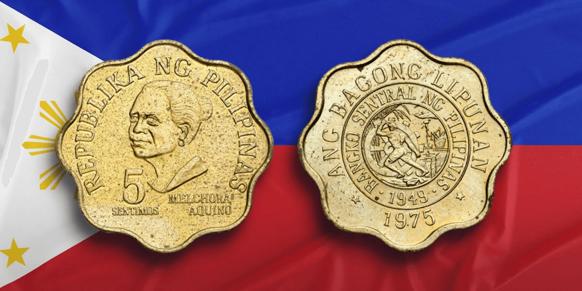 Another large order followed in 1975 for 5 sentimo pieces in brass and 1 sentimo pieces in aluminium, the former having a scalloped or wavy edge and the latter being square. Both feature a man turning a large wheel with a ship unloading cargo in the background, with the native chief Lapulapu on the 1 sentimo and, shown here, the revolutionary hero Melchora Aguino on the 5 sentimos.