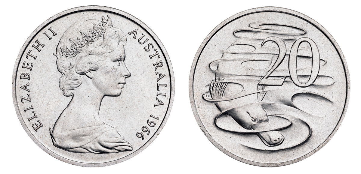 When Australia changed over to a decimal coinage of dollars and cents in 1966, The Royal Mint was again involved in the production of master tools and coins to assist the newly-opened Royal Australian Mint in Canberra. The decimal coins feature an attractive series of wildlife designs by Stuart Devlin, among them a duck-billed platypus on this twenty-cent piece.