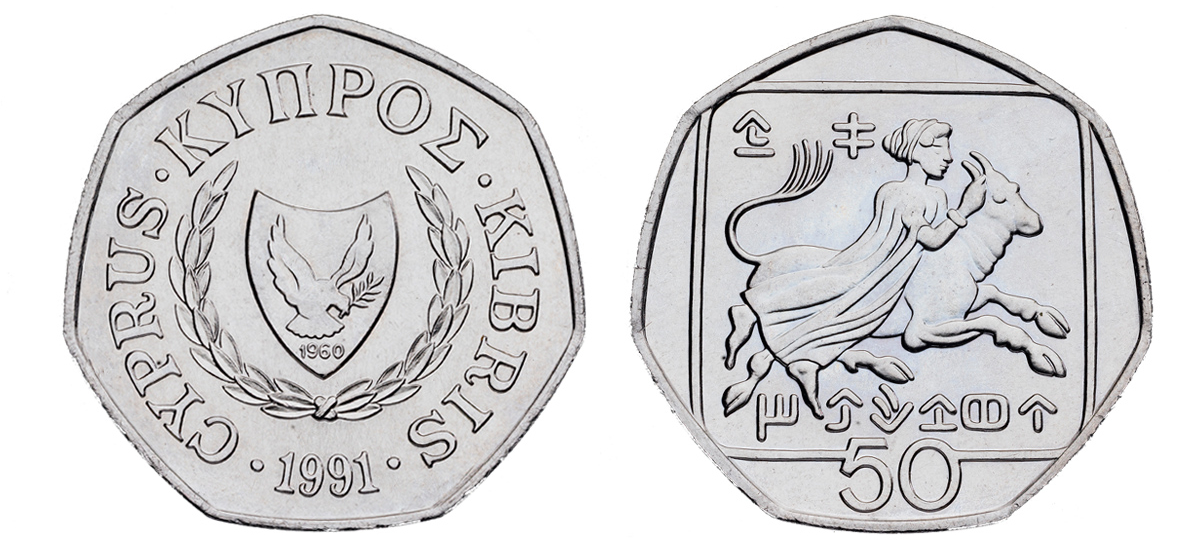 In 1983 a currency system of 100 cents to the pound saw the introduction of new coins in aluminium and nickel-brass. For their obverse they retained the emblem of the Republic, but the reverses now show a pied wheatear, a modern vase, an old silver bowl, two goats, a stylised bird, and a cyclamen. A 50 cent coin was added to the coinage in 1985 and, shown here, is the cupro-nickel 50 cent coin of 1991, now seven-sided in shape and showing Europa and the bull.