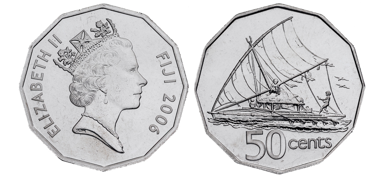 Other coins have since been struck for Fiji and shown here is a twelve-sided 50 cent piece of 2006 featuring a small sailing vessel similar to that on the original shilling of 1934.