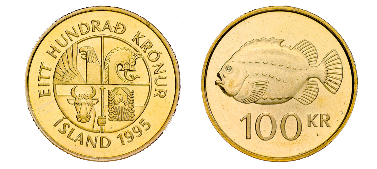 This 100 kronur coin of 1995 features on the obverse the guardian spirits – a bull, a bird, a dragon and a giant – that protect the island, with a north Atlantic lumpfish on the reverse.