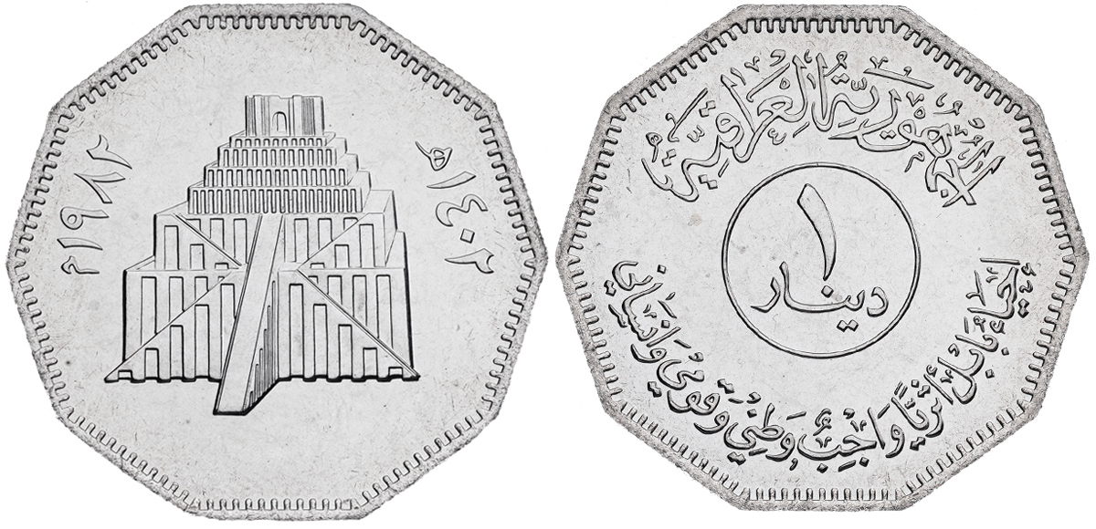 The 1 dinar of 1982, shown here, features the Tower of Babylon.