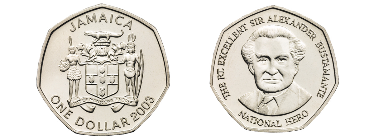 Shown here is a one dollar coin of 2014, which combines the usual Coat of Arms with a portrait of Sir Alexander Bustamante, the first Prime Minister of Jamaica and a national hero.