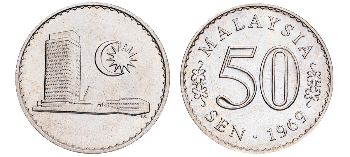 Their designs, however, show on the obverse a representation of Parliament House in Kuala Lumpur, while on the reverse the denominational value is prominently displayed, accompanied by a stylised version of the national flower, the hibiscus.