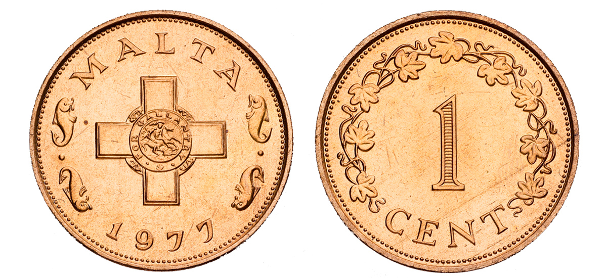 Normal British coins also circulated in Malta and it was not until 1972 that the island introduced a distinctive coinage of its own. Prepared by The Royal Mint, the new coinage was an unusual range of round and shaped coins in cupro-nickel, bronze and aluminium. The designs, which represent aspects of the island’s history, were the work of the celebrated British artist Christopher Ironside, who had recently achieved numismatic distinction with his reverse designs for the new decimal coinage of the United Kingdom.