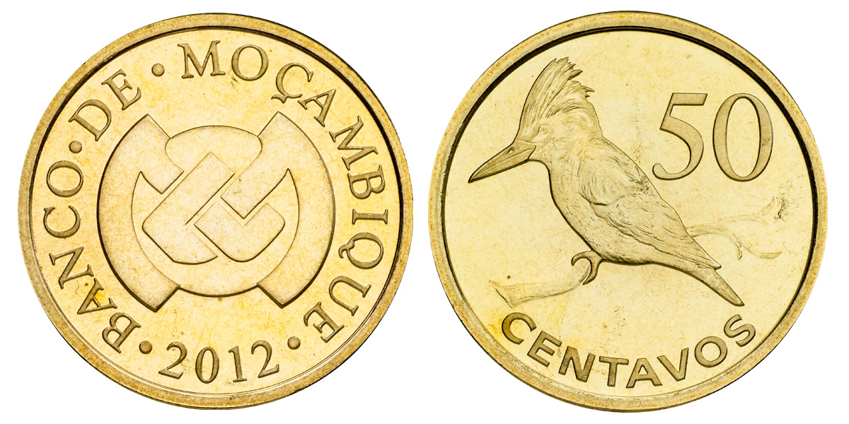 In 1998 The Mint struck a coin of 5000 meticais, which combines the arms of the republic with electric pylons. More recently coins have been struck for a new system in which the revalued metical consists of 100 centavos. Shown here is a 50 centavos of 2012, which combines the kingfisher with the emblem of the Bank of Mozambique.