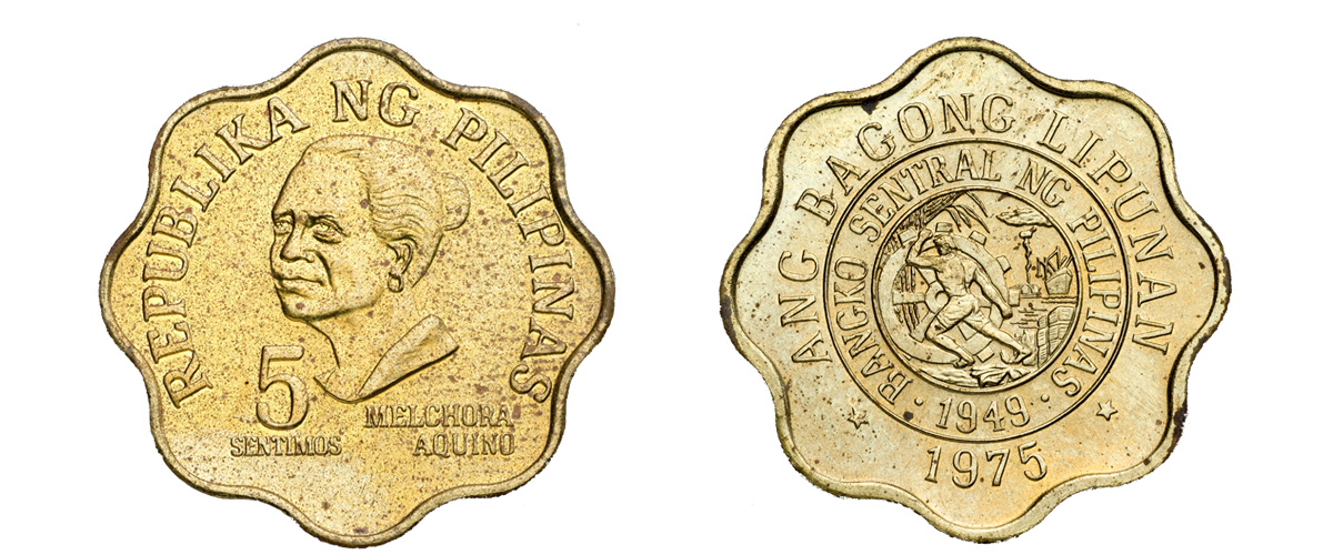 Another large order followed in 1975 for 5 sentimo pieces in brass and 1 sentimo pieces in aluminium, the former having a scalloped or wavy edge and the latter being square. Both feature a man turning a large wheel with a ship unloading cargo in the background, with the native chief Lapulapu on the 1 sentimo and, shown here, the revolutionary hero Melchora Aguino on the 5 sentimos.