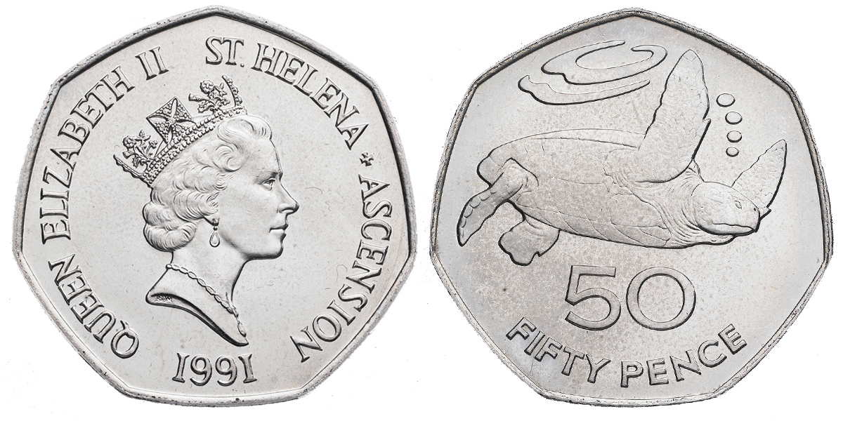 Shown here is a 50p piece of 1991, which mirrors the seven-sided shape of the corresponding United Kingdom coin.