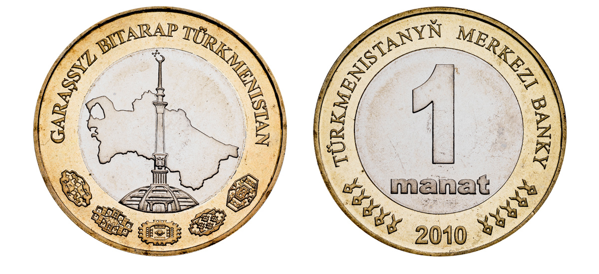 Following the death of the President in 2006, coins of new design were struck in 2009. On these coins the portrait of the late President was replaced by a design showing the Independence Monument in Ashgabat superimposed on a map of Turkmenistan.