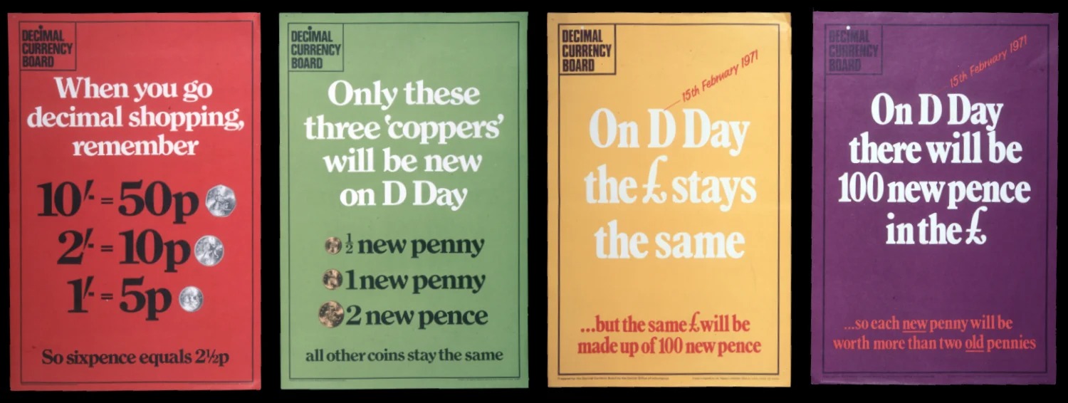 Posters issued by the Decimal Currency Board in advance of decimalisation in 1971