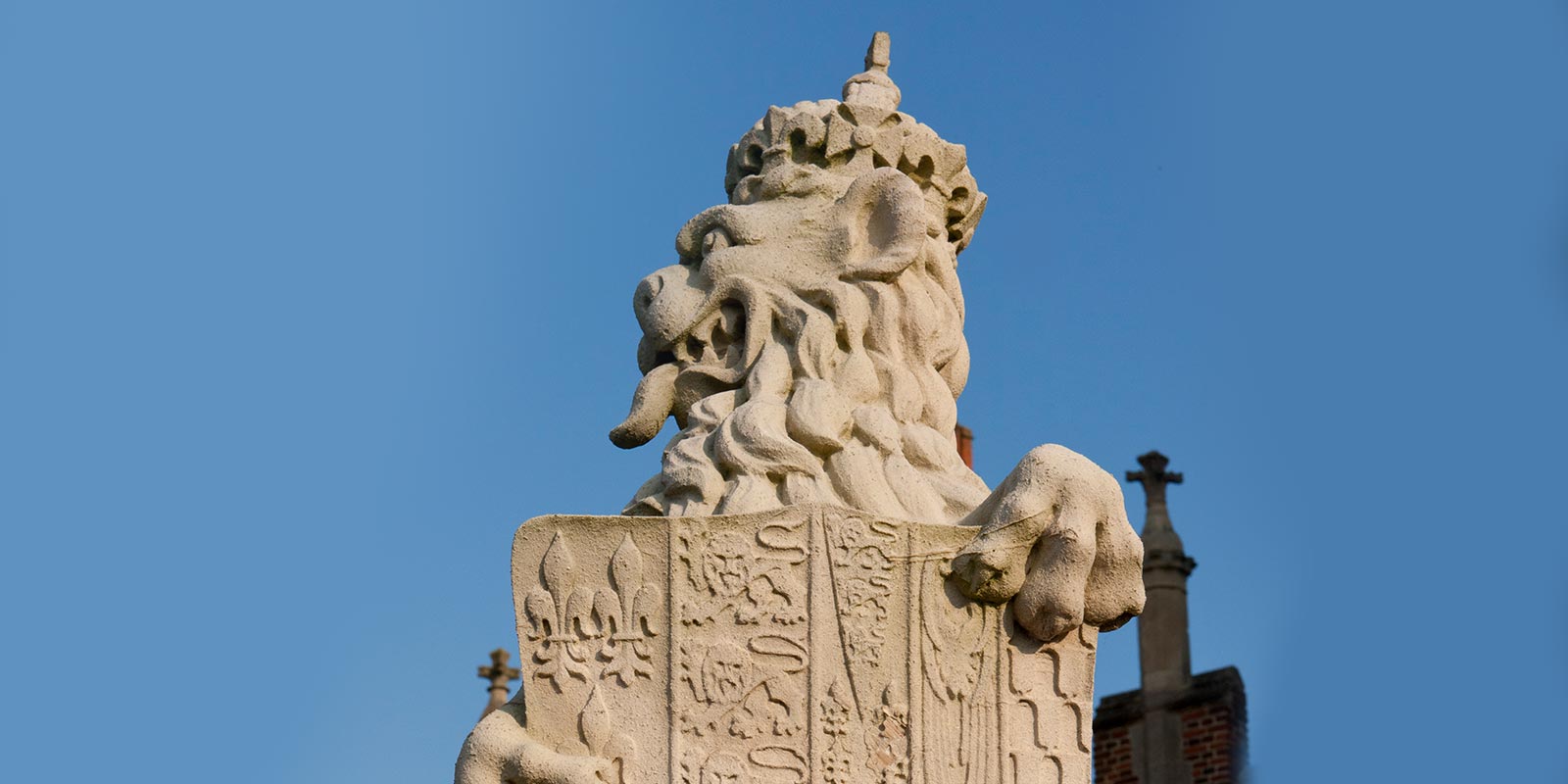 A brave and ferocious lion has featured on the shield of England for as long as it has existed. The lion represents English courage, strength, dignity and pride – traits that no animals native to the country at the time seemed to possess. The Lion of England assumed royal beast status in the early twelfth century during the reign of Richard I (1189–99), when heraldry was formally established. Used by Henry VIII as his dexter supporter, which means it appears on the viewer’s left-hand side, the Lion of England remains an iconic heraldic symbol to this very day, and perhaps in modern times is more representative of Britishness rather than Englishness. One of the first beasts to flank the parapets of the Moat Bridge of Hampton Court Palace, the crowned lion supports a shield bearing the impaled arms – a combination of two coats of arms – of Henry VIII and Jane Seymour.
