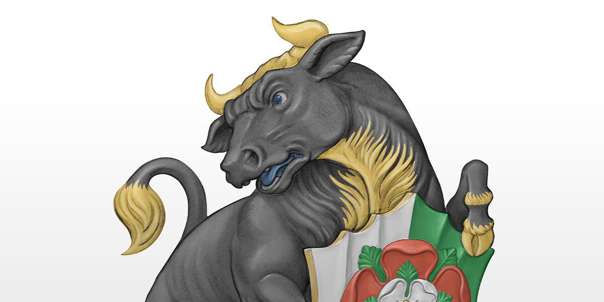 Bulls, calves, cows and buffalo can all be found in heraldry. They are styled in many colours, as they are so diverse in the real world that they are never depicted ‘proper’, which means to be seen in their natural colours. In Henry VIII’s time, the statue of the Bull of Clarence would have been painted black, with many features that would appear unusual to the modern eye. His eyes and pupils would also have been black, with horns, hooves and crests of hair highlighted in gold. David Lawrence has successfully made his bull fierce and imposing, its power captured with great skill in the low relief and single colour of the coin.